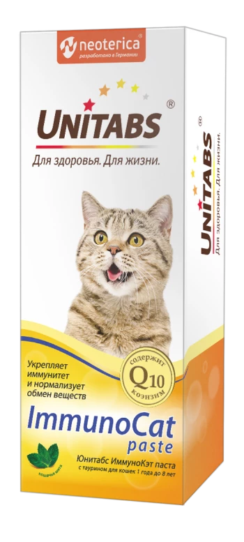 Unitabs ImmunoCat — это витаминно-минеральный комплекс для кошек, который содержит коэнзим Q10 и все необходимые витамины, макро- и микроэлементы для нормализации обмена веществ и укрепления иммунитета.