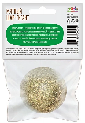 Эксклюзивная игрушка от Деревенских лакомств Мятный шар Гигант — лакомство для кошек из кошачьей мяты. Играть в нее не надоест никогда. В состав входят только кошачья мята и пчелиный воск. Благодаря пчелиному воску, мята в шаре всегда остается свежей и, при каждом ударе лапой, запах становится сильнее. Эту игрушку можно даже съесть. Она состоит только из натуральных ингредиентов и ваша кошка получит огромное удовольствие.