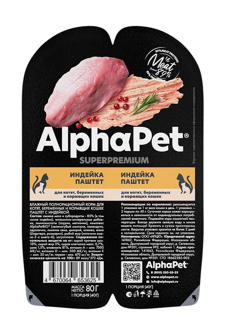 Влажный полнорационный корм для котят, беременных и кормящих кошек паштет с индейкой AlphaPet Superpremium