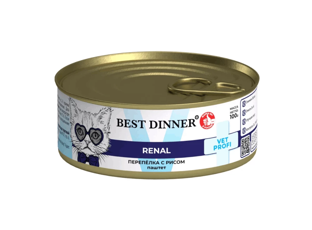 Влажный консервированный функциональный корм для кошек с заболеваниями почек содержит умеренное количество легкоусваиваемого животного белка из натурального мяса перепелки.Мясо перепела обладает диетическими свойствами, оно улучшает пищеварение, очищает кишечник от шлаков – с таким питанием невозможно набрать избыточный вес, который грозит малоподвижным, кастрированным и пожилым питомцам. Дрожжи полезны для кожи и шерсти, работы желудка и кишечника, укрепляют иммунитет. Таурин - незаменимая аминокислота, которая важна для здоровья глаз, шерсти, органов пищеварения, мочеполовой и репродуктивной систем. Юкка Шидигера снижает запах из лотка и способствует выведению токсинов из организма. Большое содержание влаги необходимо для правильного функционирования выделительной системы. Позаботьтесь о здоровье любимца вместе с Best Dinner!