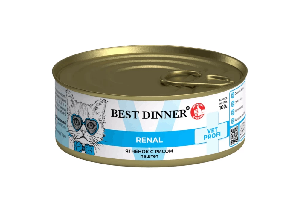 Влажный консервированный функциональный корм для кошек с заболеваниями почек содержит умеренное количество легкоусваиваемого животного белка из натурального мяса ягненка. Мясо ягненка, отлично подойдет для чувствительного пищеварения. Сниженное содержание магния и фосфора не нагружает почки способствуя поддержанию функции почек. Дрожжи полезны для кожи и шерсти, работы желудка и кишечника, укрепляют иммунитет. Таурин - незаменимая аминокислота, которая важна для здоровья глаз, шерсти, органов пищеварения, мочеполовой и репродуктивной систем. Юкка Шидигера снижает запах из лотка и способствует выведению токсинов из организма. Большое содержание влаги необходимо для правильного функционирования выделительной системы. Позаботьтесь о здоровье любимца вместе с Best Dinner!