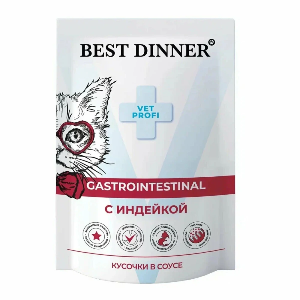 Паучи Best Dinner Exclusive Gastro Intestinal кусочки в соусе с Индейкой для взрослых кошек с чувствительным пищеварением.