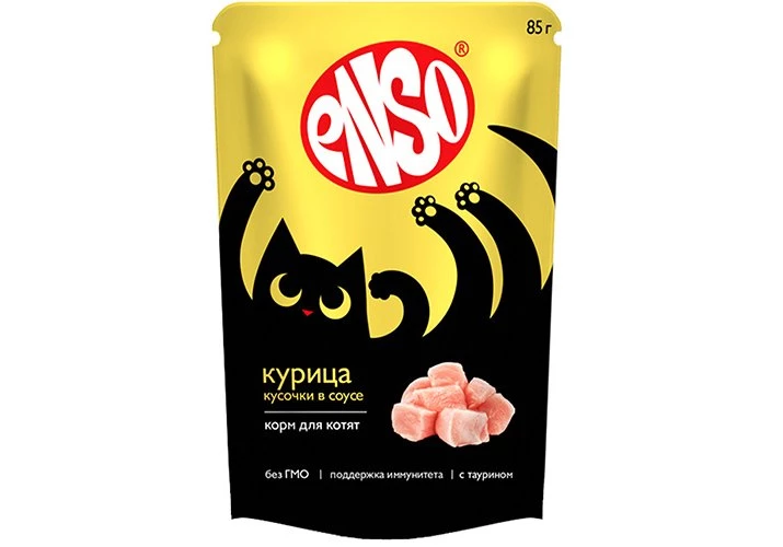 NSO® Влажный полнорационный корм для котят, кусочки в соусе с курицей. Для изготовления корма использовано отборное мясо и мясные субпродукты первой категории от проверенных поставщиков. По своей природе кошки достаточно избирательны в еде, это практически запрограммировано в их ДНК. Благодаря сбалансированному составу и натуральным ингредиентам, нежные мясные кусочки ENSO® в аппетитном соусе очаруют котят уже при первом знакомстве с кормом. Низкозерновая рецептура без глютена с тщательно подобранными витаминами и минералами, отсутствие ГМО и идеальное сочетание вкуса позволят котятам всегда оставаться активными и здоровыми, проявлять и сохранять свою настоящую сущность. ENSO® c курицей для котят обогащен всеми необходимыми добавками для поддержания растущего организма: *Молоко - источник витаминов и минералов, необходимых растущему и развивающемуся организму котят; *Рыбий жир, льняное и подсолнечное масло (источники Омега 3, 6 жирных кислот; линолевой кислоты) поддерживают здоровье кожи и красоту шерсти; *Экстракт эхинацеи стимулирует работу иммунной системы; *Экстракт календулы стимулирует работу ЖКТ; *Таурин - незаменимая аминокислота для здоровья кошек всех возрастов. СОСТАВ: Мясо и мясные субпродукты 40% (в том числе курица не менее 12%), рис, молоко, витамины и минералы, рыбий жир, масло льняное, масло подсолнечное, экстракт эхинацеи, экстракт календулы, таурин. АНАЛИЗ: Влажность - 81%, Белки - 9%, Жиры - 4,2%, Клетчатка - 0,3%, Зола - 1,6%. ДОБАВКИ НА 1КГ: Магний - 0,6г/кг, Железо - 90мг/кг, Медь - 4,5мг/кг, Марганец - 4мг/кг, Цинк 50мг/кг, Витамин А - 5000МЕ/кг, Витамин D - 200МЕ/кг, Витамин Е - 18МЕ/кг