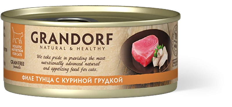 Состав: 45% филе тунца, 30% куриная грудка, 25% собственный сок, 0% зерновых
