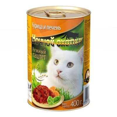 Влажный консервированный корм для кошек Ночной охотник Курица/Печень кусочки в паштете 415гр