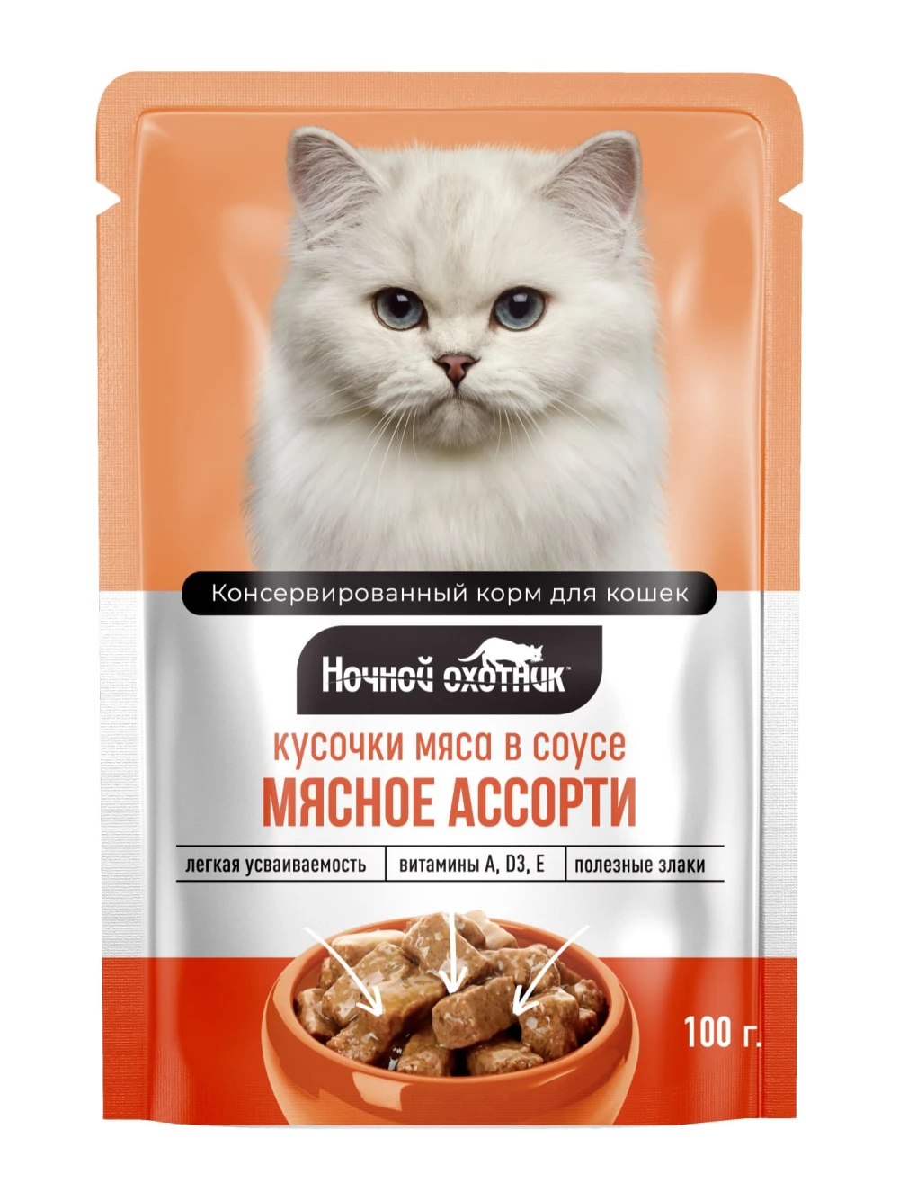 Полнорационное сбалансированное питание для кошек . Изготовлено из натурального мяса, не содержит сои, консервантов и ГМО.