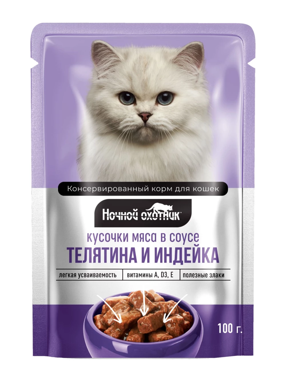 Состав: Мясо и субпродукты (телятина не менее 10%, индейка не менее 10%), злаки, растительное масло, минеральные вещества, таурин, витамины А, D, E (tocopherol).