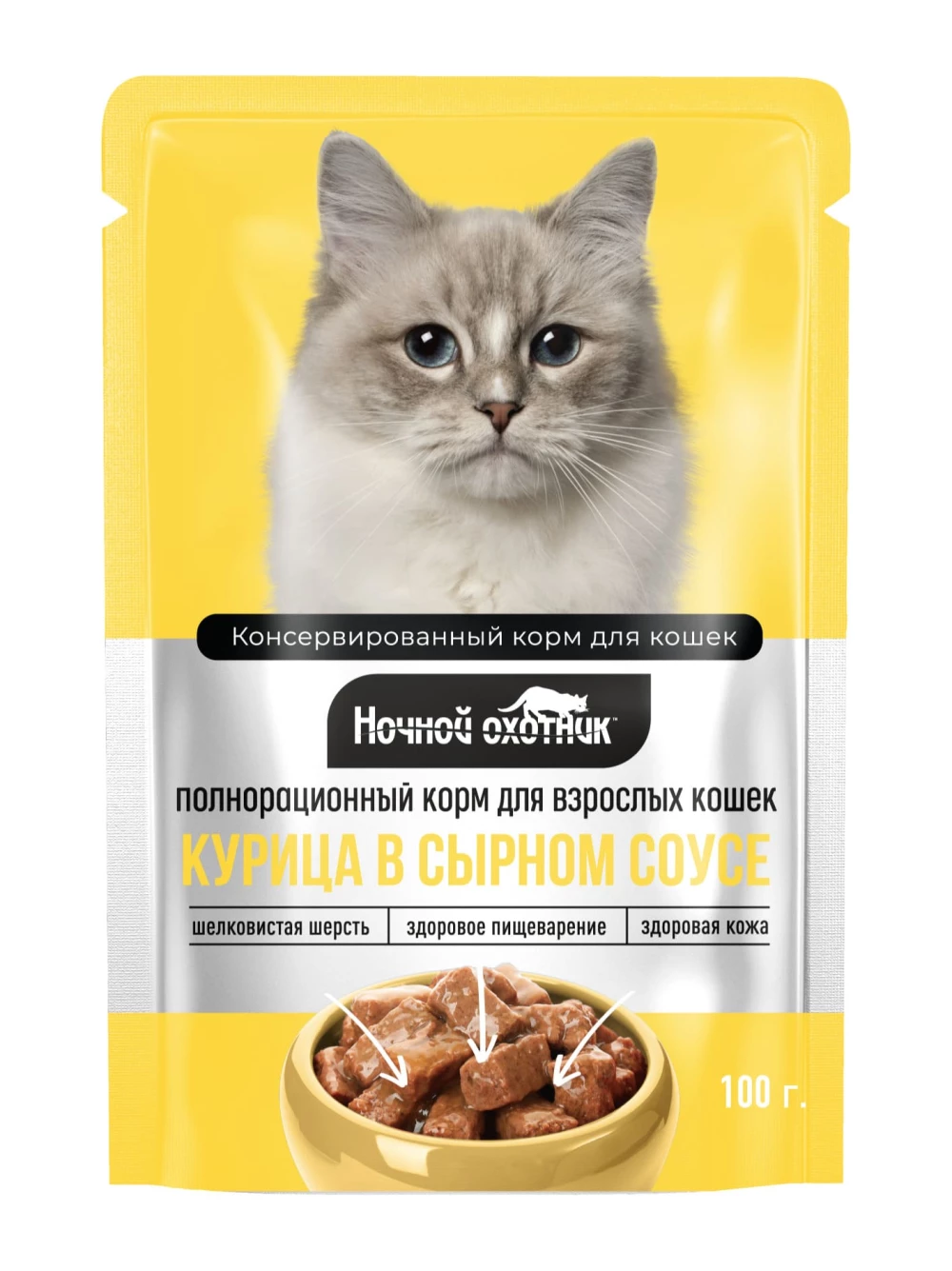 Полнорационное сбалансированное питание для кошек . Изготовлено из натурального мяса, не содержит сои, консервантов и ГМО.