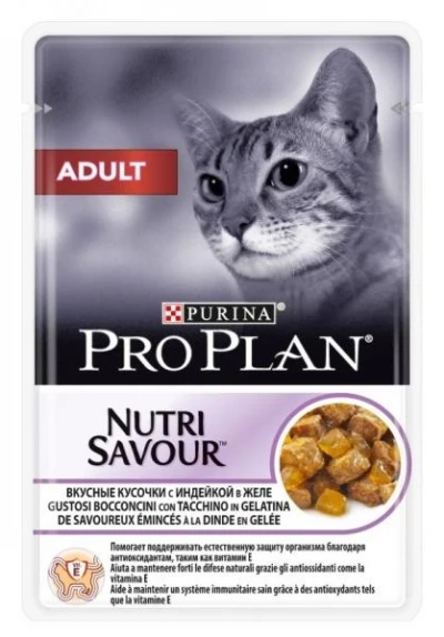 Предназначен для взрослых кошек от 1 года. Стимулирует работу мочевыводящего тракта. PRO PLAN Adult для взрослых кошек содержит сбалансированный комплекс питательных веществ, включая витамины и минералы, со вкусом, который так нравится кошкам. Новый влажный корм приготовлен с заботой экспертами компании PURINA. PRO PLAN Adult для взрослых кошек сделан из кусочков индейки в аппетитном желе.