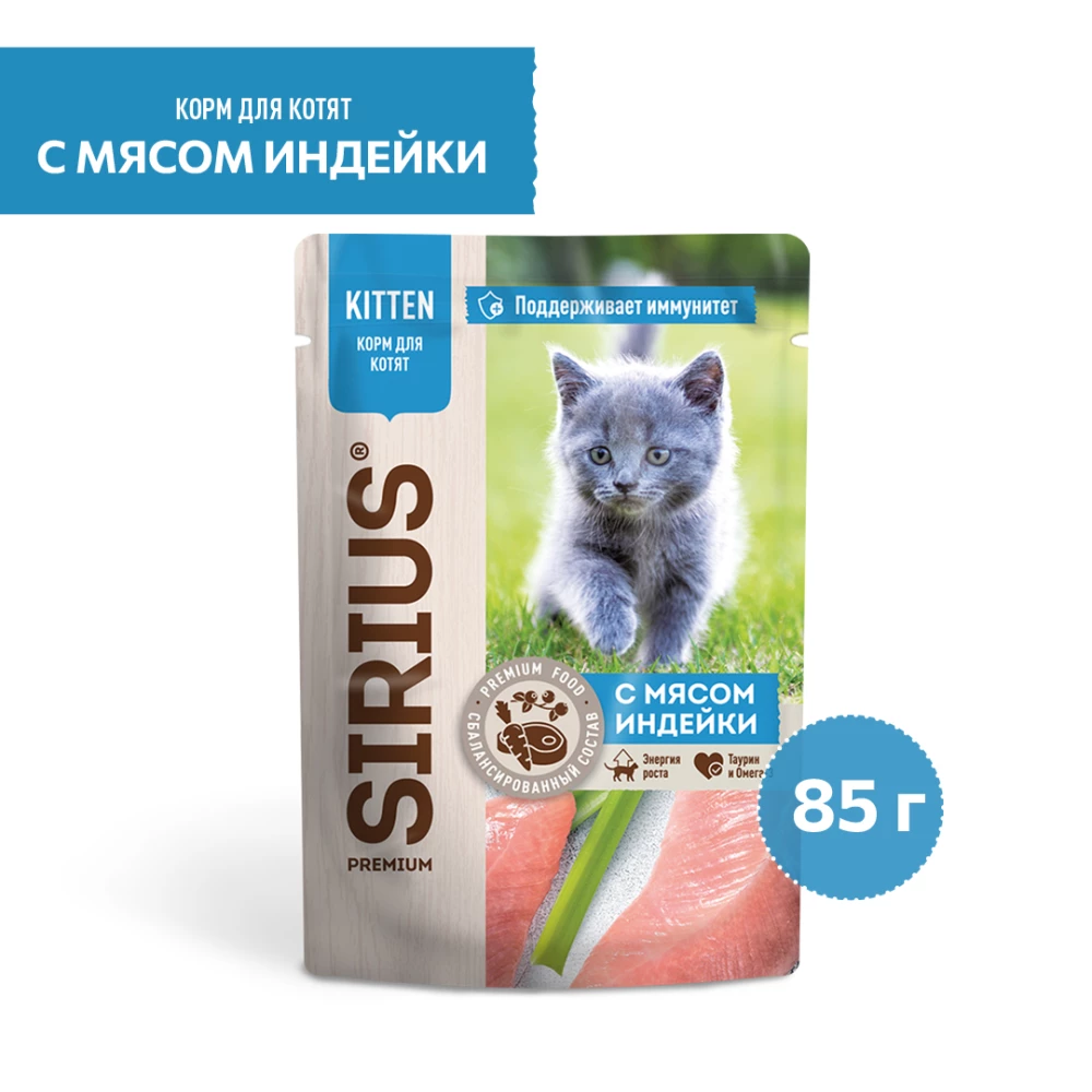 SIRIUS — влажный корм премиум-класса для полноценного ежедневного рациона котят с 1-2-х месяцев до 1 года.