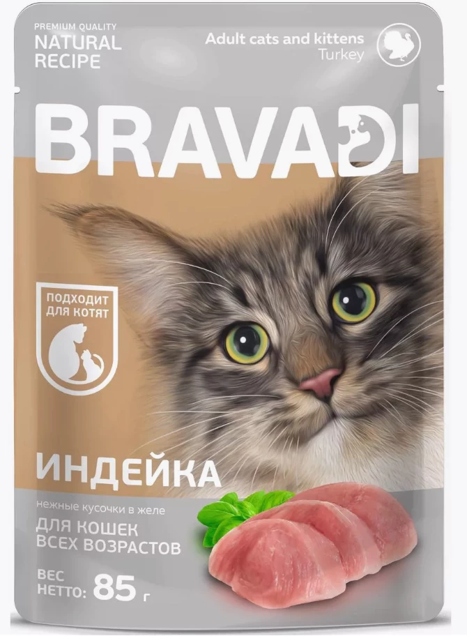 Курица, мясо и мясные ингредиенты (в т.ч. мясо индейки не менее 4%), злаки, горох, витамины и минеральные вещества, таурин. ПИЩЕВАЯ ЦЕННОСТЬ (100 г) Белки - 7 г, жиры - 4 г, зола - 2,5 г, клетчатка -0,5 г, влага - 82 г, витамин А - 90 ME, витамин D - 9 ME, витамин Е - 0,5 ME. Калорийность - не менее: 76 ккал/ 318 кДж. Консервированный корм BRAVADI котятам и кошкам – это полнорационный влажный рацион, который предназначен для кормления котят и взрослых кошек. Разработан и произведен с учетом потребностей кошки: отличные вкусовые качества и сбалансированное соотношение белков и жиров для оптимального развития и поддержания питомца на всех этапах жизни. 100% натуральные ингредиенты. Содержит таурин, необходимый кошкам для нормального функционирования сердечной мышцы, здоровья зрения, поддержания здоровой иммунной системы. Корм обогащен комплексом витаминов и микроэлементов для поддержания правильного обмена веществ в организме. Не содержит красителей, консервантов, ГМО и сои.