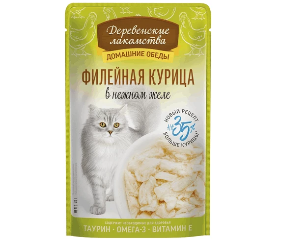 Консервированный влажный корм для кошек серии «Деревенские лакомства — Домашние обеды» — полноценный обед для вашей кошки, представляющий собой нежные кусочки курицы, приготовленные на пару и залитые аппетитным натуральным желе. Этот корм не только доставит удовольствие вашему питомцу, но и обеспечит его энергией для активной жизни. Легкая текстура желе облегчает процесс потребления, делая этот продукт идеальным даже для самых привередливых питомцев. Побалуйте своего любимца изысканным и полезным лакомством!