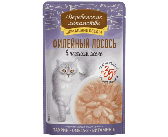 Консервированный влажный корм для кошек серии «Деревенские лакомства — Домашние обеды» из филейного лосося в нежном желе для кошек — настоящее кулинарное волшебство для пушистых любимцев. Каждый бережно отобранный кусочек сочного лосося насыщен омега-3 жирными кислотами, способствующими здоровью кожи и шерсти. Легкая текстура желе облегчает процесс потребления, делая этот продукт идеальным даже для самых привередливых питомцев. Ваши забота и внимание обязательно будут оценены!