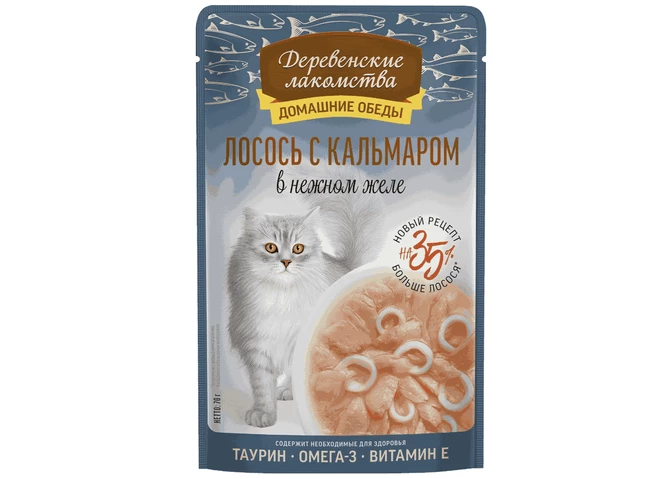 Консервированный влажный корм для кошек серии «Деревенские лакомства — Домашние обеды» — искусно приготовленные на пару ломтики лосося в дуэте с кальмаром. Изысканное лакомство, которое порадует абсолютно всех четвероногих гурманов. Легкая текстура желе облегчает процесс потребления, делая этот продукт идеальным даже для самых привередливых питомцев. Ваши забота и внимание обязательно будут оценены!