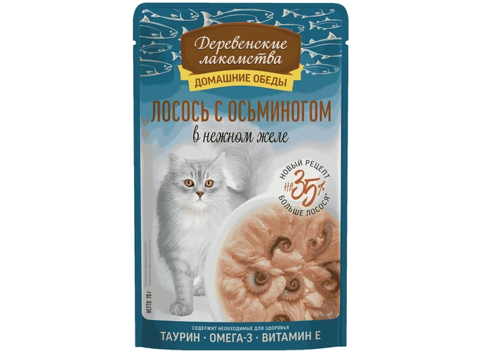 Консервированный влажный корм для кошек серии «Деревенские лакомства — Домашние обеды» с лососем и экзотическим осьминогом — это не просто лакомство, а настоящий кулинарный шедевр, созданный с любовью и заботой о ваших пушистых гурманах. Рецепт с богатыми омега-3 жирными кислотами, белком и минералами разработан специально для здоровья кожи и шерсти вашего питомца, а также для поддержания его иммунитета и общей физической формы. Легкая текстура желе облегчает процесс потребления лакомства, делая этот продукт идеальным даже для самых привередливых питомцев.