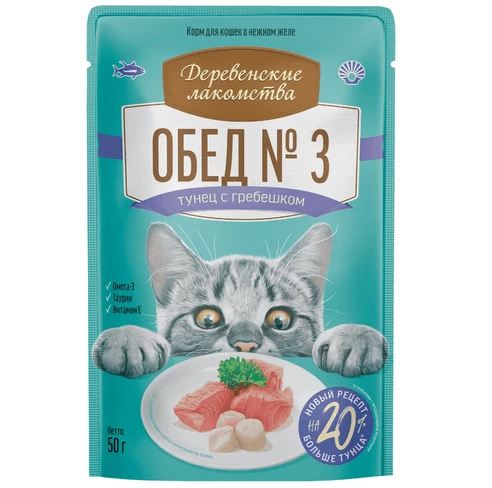 Консервированный влажный корм для кошек серии «Деревенские лакомства — Рыбные обеды» содержит большое количество мяса тихоокеанского тунца, которое идеально сочетается с насыщенным вкусом морского гребешка. Тёмное мясо тунца отличается нежной текстурой и более ярким ароматом, такое мясо насыщает корм вкусом морской рыбы. Подаётся в нежном желе, которое не только улучшает текстуру корма, но и способствует лучшему усвоению питательных веществ.
