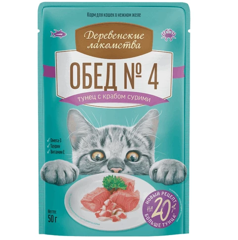 Консервированный влажный корм для кошек серии «Деревенские лакомства — Рыбные обеды» идеально сочетает вкусы тихоокеанского тунца и кусочков крабового мяса. Тёмное мясо тунца отличается нежной текстурой и более ярким ароматом, такое мясо насыщает корм вкусом морской рыбы. Подаётся в нежном желе, которое не только улучшает текстуру корма, но и способствует лучшему усвоению питательных веществ.