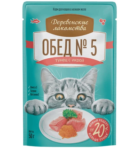 Консервированный влажный корм для кошек серии «Деревенские лакомства — Рыбные обеды» содержит большое количество мяса тихоокеанского тунца, которое идеально сочетается с насыщенным вкусом икры летучей рыбы. Подаётся в нежном желе, которое не только улучшает текстуру корма, но и способствует лучшему усвоению питательных веществ.