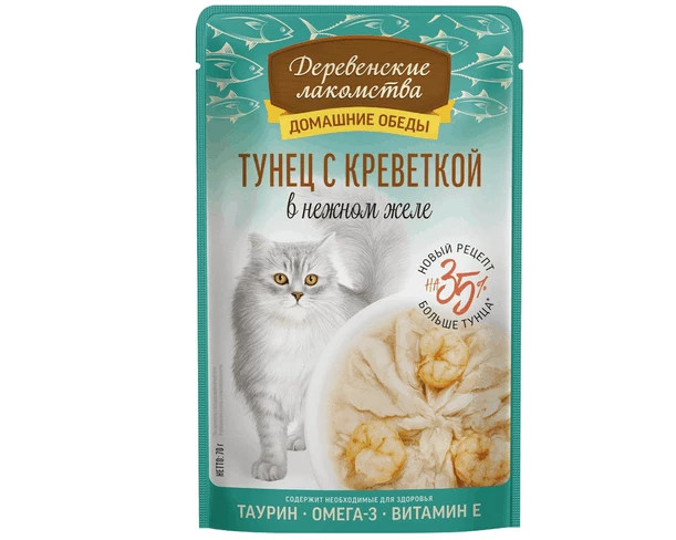 Консервированный влажный корм для кошек серии «Деревенские лакомства — Домашние обеды» приготовленный на пару из кусочков дикого тихоокеанского тунца с нежными креветками — еда для настоящих аристократов! Витамины, минералы и таурин — это лишь приятное дополнение к изысканному блюду для котов и кошек всех пород. Легкая текстура желе облегчает процесс потребления, делая этот продукт идеальным даже для самых привередливых питомцев. Побалуйте своего любимца изысканным и полезным лакомством!