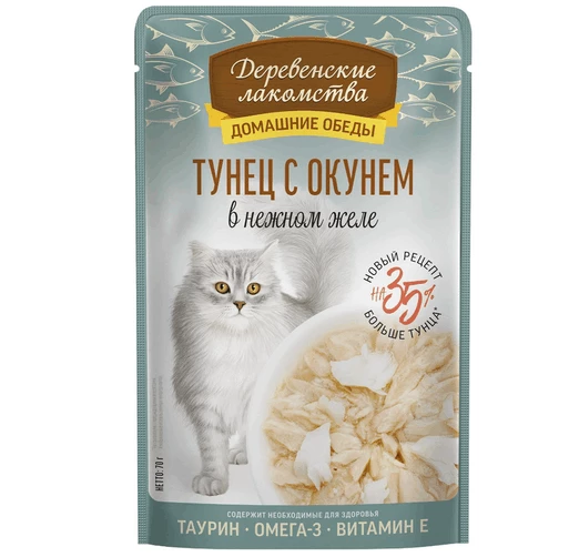 Консервированный влажный корм для кошек серии «Деревенские лакомства — Домашние обеды» — изысканный деликатес из дикого тихоокеанского тунца и морского окуня. Эта гармоничная комбинация не только восхитительна на вкус, но и обеспечивает вашего питомца ценными белками и омега-3 жирными кислотами, необходимыми для поддержания здоровья и жизненной энергии. Легкое, воздушное желе придает блюду неповторимую текстуру и дополнительную сочность.