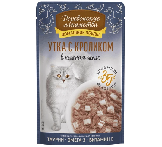 Консервированный влажный корм для кошек серии «Деревенские лакомства — Домашние обеды» — это изысканное угощение. В нем тщательно отобранные кусочки утиной грудки превосходно сочетаются с легкоусвояемым мясом кролика, формируя уникальную комбинацию, которая придется по вкусу всем, кто заботится о здоровом рационе. Легкая текстура желе облегчает процесс потребления, делая этот продукт идеальным даже для самых привередливых питомцев.