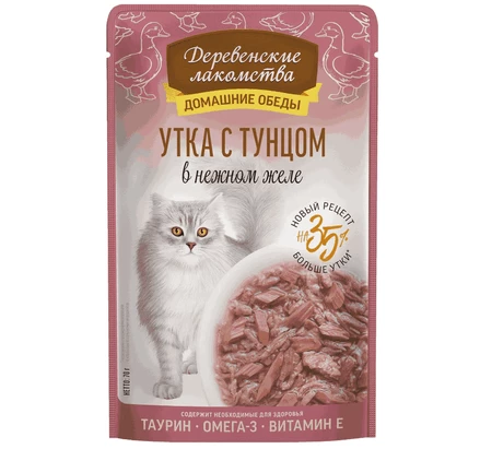 Консервированный влажный корм для кошек серии «Деревенские лакомства — Домашние обеды» — изысканное сочетание вкусов отборной утиной грудки и ароматного тунца. Приготовленные на пару кусочки источают аромат, который возбудит аппетит даже самого привередливого питомца. Легкое, воздушное желе придает блюду неповторимую текстуру и дополнительную сочность.