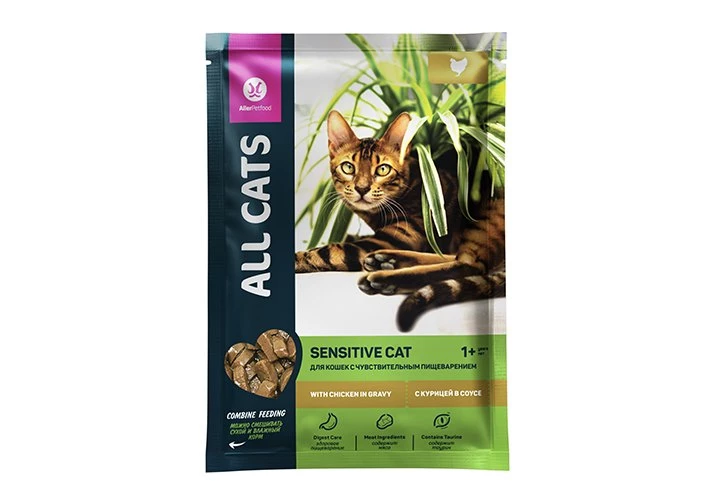 ALL CATS Sensitive — это полноценный премиальный корм для кошек всех пород с чувствительным пищеварением. Состав корма ALL CATS Sensitive обеспечивает кошку всеми необходимыми питательными веществами. Добавка с отборными пребиотиками способствует росту полезной микрофлоры кишечника, облегчает переваривание и полноценное усвоение пищи. Обогащен витаминами, минералами и аминокислотой таурин для хорошего зрения и сильной иммунной системы. Качество и свойства продукта: • Корм премиум класса для кошек с чувствительным пищеварением • Полноценный рацион для любых пород • Пребиотик для роста полезной микрофлоры кишечника, облегчает переваривание и полноценное усвоение пищи • Жирные кислоты Омега-3 и Омега-6 делают шерсть здоровой и блестящей • Растительные и животные протеины для легкой и полноценной усвояемости • Таурин для поддержания острого зрения • Витамины и минералы для поддержки здоровья и хорошего самочувствия питомца ИНГРЕДИЕНТЫ: мясо и мясные субпродукты, мясо птицы (курица мин. 5%) рыба и рыбные субпродукты, протеины растительного происхождения (злаки,горох) протеины животного происхождения, витаминно-минеральная добавка, масло льняное, пребиотик.