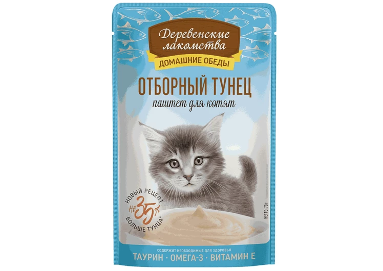 Консервированный влажный корм для котят серии «Деревенские лакомства — Домашние обеды» в форме паштета из тунца обогащен витамином Е, омега-3 и таурином, имеет нежную текстуру и яркий рыбный аромат. Натуральный состав и полезные добавки помогут вашему котенку расти здоровым, полным сил и энергии!