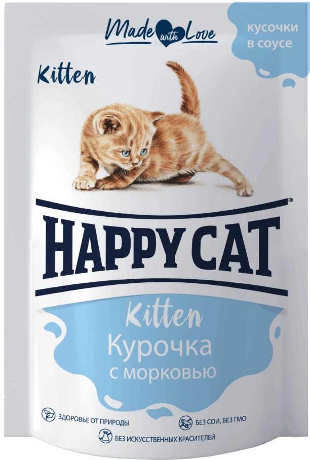 Полноценный корм Happy Cat Курочка с морковью кусочки в соусе обеспечивает правильное и разнообразное питание кошки. Вкусный и натуральный корм содержит качественно отобранные ингредиенты, чтобы порадовать даже самую привередливую кошку. Уникальная технология приготовления позволяет сохранить все ценные свойства натуральных продуктов, чтобы ваш питомец был здоров и полон сил. Содержится инулин - натуральный пребиотик, улучшающий пищеварение вашего питомца.