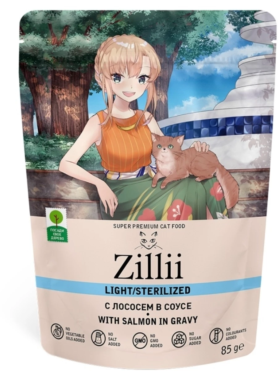 Уделяя пристальное внимание правильному питанию кошки после стерилизации и/или при наборе лишнего веса можно избежать различных проблем, связанных со здоровьем животного.Полнорационный сбалансированный влажный корм ZILLII ADULT CAT LIGHT/STERILIZED with Salmon in gravy, учитывающий особенности организма такой кошки, изготовлен c использованием мяса лосося.Лосось - исключительный источник высококачественного белка, кальция, фосфора и жирных кислот Омега 3, являющиеся крайне необходимым компонентом для здоровья кожи, шерсти и правильного функционирования всего организма. В формулу влажного корма Зиллии добавлен L-карнитин, регулируя жировой обмен в организме животного, он помогает бороться с лишним весом. **СОСТАВ**: Мясо курицы, мясные и куриные субпродукты, лосось, злаки, горох, клетчатка, витамины, минералы, Омега-3 и Омега-6 жирные кислоты, таурин, L-карнитин.