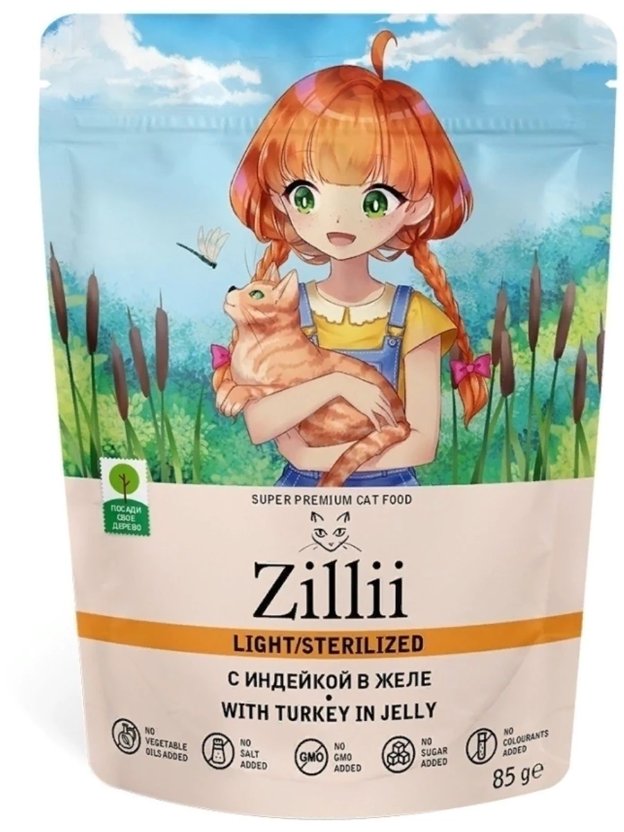 Вероятность набора лишнего веса - вот основная проблема стерилизованного животного.Сбалансированный полнорационный влажный корм ZILLII ADULT CAT LIGHT/STERILIZED with Turkey in gravy учитывает все особенности организма такой кошки.В составе формулы влажного корма Зиллии присутствует мясо индейки - наиболее диетическое и нежное мясо, обладающее прекрасной усвояемостью и содержанием питательных веществ. Содержащийся в индейке натрий помогает пополнить объемы плазмы в крови и обеспечить нормальные обменные процессы. Оптимально сбалансированные жирные кислоты Омега 3 и Омега 6 способствуют поддержке здоровья кожных покровов и шерсти животного, а добавленный в формулу L-карнитин, регулируя жировой обмен в организме животного, помогает бороться с лишним весом. **СОСТАВ**: Мясо курицы, мясные и куриные субпродукты, индейка, злаки, горох, клетчатка, витамины, минералы, Омега-6 и Омега-3 жирные кислоты, таурин, L-карнитин.