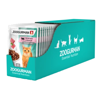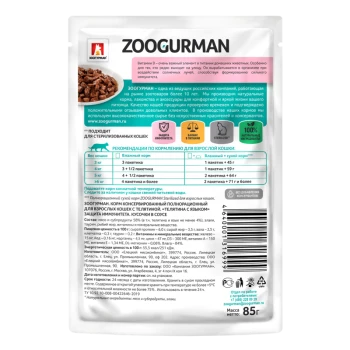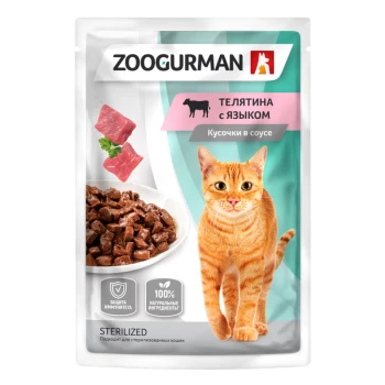 Зоогурман. Корм консервированный полнорационный для взрослых кошек с телятиной. «Телятина с языком» Защита иммунитета. Кусочки в соусе.