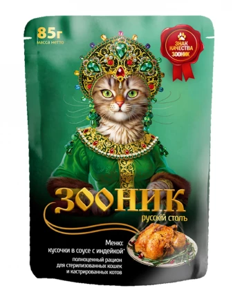 Полнорационное меню для кошек с кусочками индейки в нежном соусе.Состав:Мясо и мясные субпродукты (в т.ч. индейка не менее 4%), злаки, витамины и минеральные вещества.