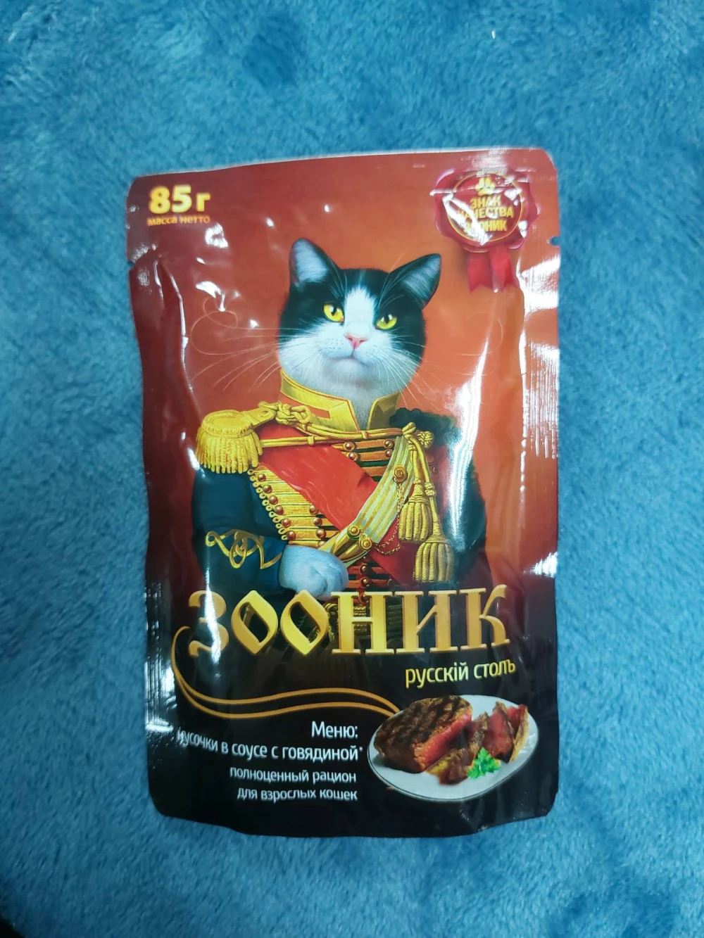 Полнорационное меню для взрослых кошек с кусочками говядины в нежном соусе.Состав:Мясо и мясные субпродукты (в т.ч. говядина не менее 4%), злаки, таурин, минеральные вещества.