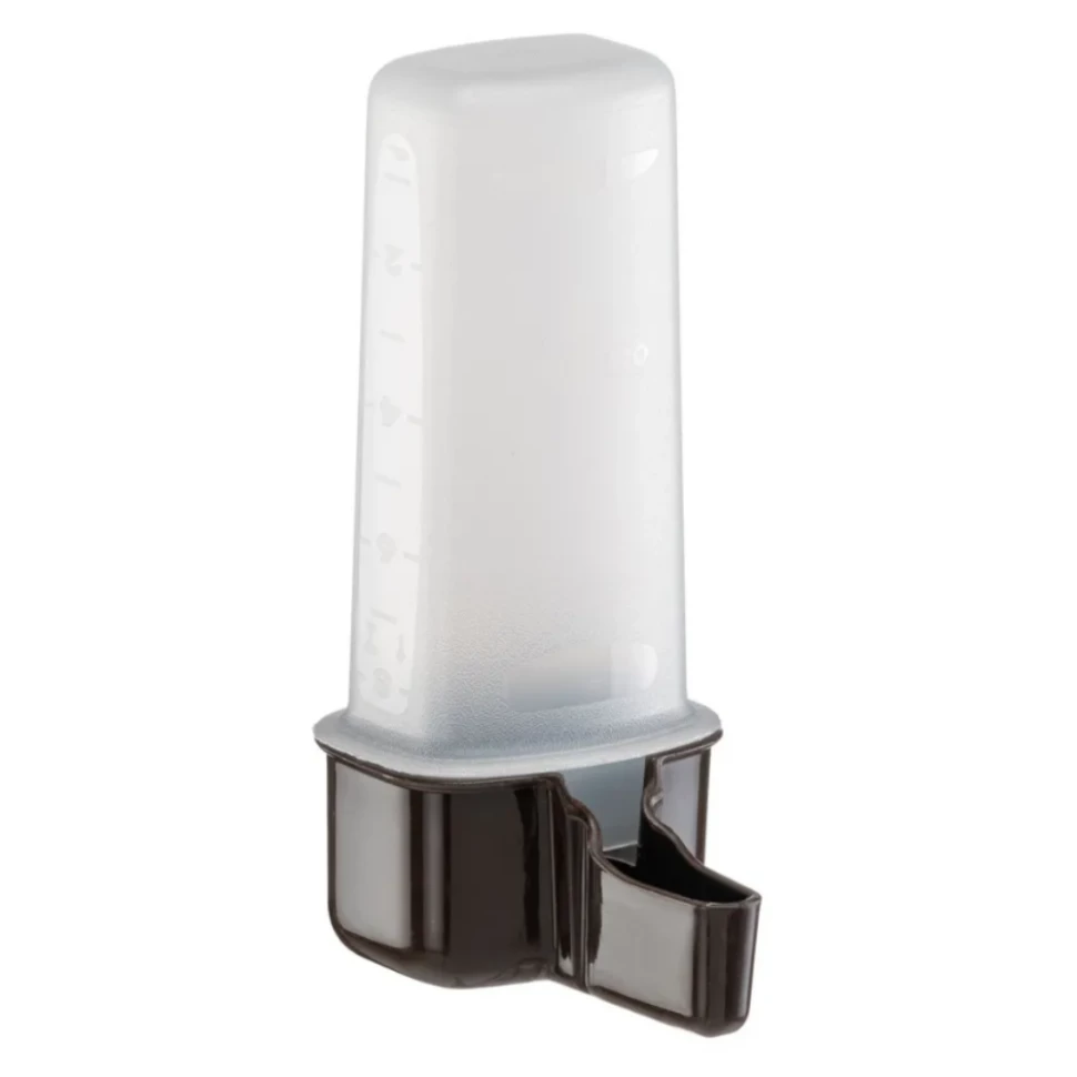 Аксессуар используется как кормушка или поилка. Узкий носик. Материал - полупрозрачный пластик для контроля расхода содержимого. Съемная верхняя часть для легкой очистки. Монтируется на горизонтальные прутья клетки.
