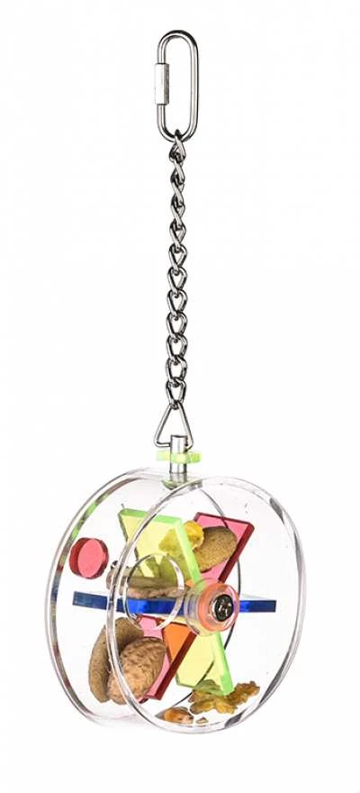 Игрушка, в которую можно спрятать пищу. Изготовлена из высококачественных материалов. Легко и надежно цепляется в клетку за металлический карабин. Характеристики: Материал: металл, пластик. Размер: 9*5 см, общая длинна 25 см. О бренде: Страна производитель: Китай