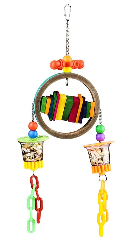 Фуражное коромысло станет любимой игрушкой вашего попугая. Изделие сделано из натурального прочного дерева и износостойкого пластика. Игрушка просто отмывается от грязи под проточной водой, не впитывает запахи. Владелец питомца может положить лакомство с стаканчик, чтобы пернатый тренировал мышцы, доставая угощение. два стаканчика для лакомств; деревянное основание; яркие пластиковые цепочки; металлический карабин с цепью.