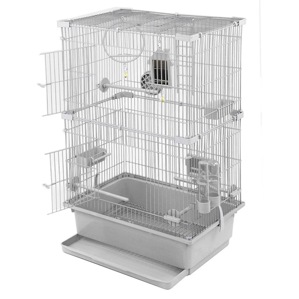 Клетка для птиц металлическая на пластиковом поддоне со вставкой. Разборная конструкция – 8 стенок и крыша. В передних 2 стенках находятся 2 дверцы. В комплекте: 1 поилка для птиц 50мл, 1 кормушка 75мл, 2 кормушки для птиц прямоугольные, 1 качели в виде кольца с колокольчиком, 4 палочки в клетку 18,5см, 1 зеркало Избушка" с колокольчиком, 1 лесенка, 1 кормушка для птиц круглая (крепится к прутьям клетки), 1 квадратное зеркало (крепится к прутьям клетки). Высота поддона 12см. Цвет поддона - светло-серый