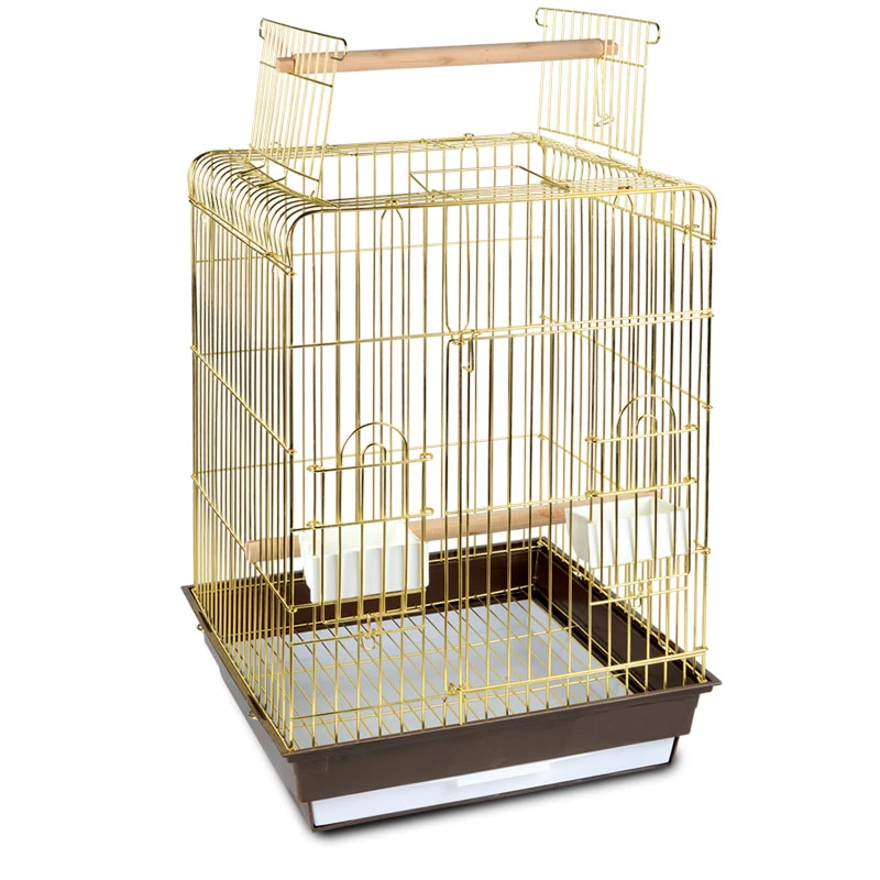 "Золотая" клетка для птиц с открывающейся крышей - полезный аксессуар для владельцев пернатых питомцев. Надежная, просторная и очень удобная, такая клетка займет достойное место в любом интерьере, отвечая всем жизненным потребностям домашних любимцев. В комплектацию изделия входят 2 пластиковые кормушки и 2 деревянные жердочки. Клетка оборудована удобной ручкой для переноски и специальным пластиковым наружным поддоном, облегчающим процесс уборки.