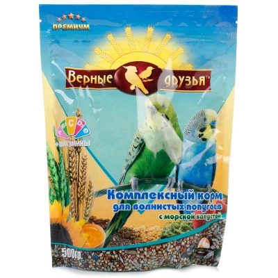 "Верные друзья" для волнистых с морской капустой - смесь отборных зерен и семян травы, богатых питательными веществами и выращенных на плодородных почвах экологически чистых регионов. Употребление корма гарантирует Вашему питомцу здоровый рост и красивое оперение. Содержащиеся в корме витамины и минералы защищают иммунную систему от паразитов и болезнетворных бактерий, и тем самым обеспечивают здоровье Вашего любимца. Деликатный подход к производству корма позволяет сохранять первозданные качества содержащихся в нём питательных элементов, витаминов и минералов, и предоставляет птицам то, что дает им природа.