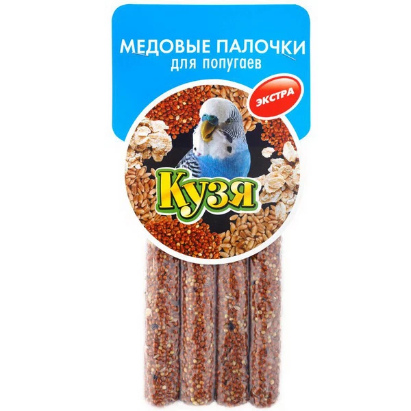 Медовые палочки «КУЗЯ» - вкусное дополнение к ежедневному рациону Вашего любимца. Это лакомство изготовлено из зёрен и мёда Алтая и Сибири. Просто укрепите палочку в клетке Вашего питомца.