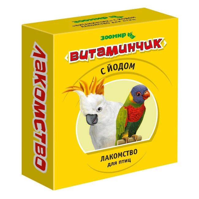 Зоомир "Витаминчик" с морскими водорослями (природный источник биогенного йода) - лакомство для певчих и декоративных птиц, доставляющее им вкусовое наслаждение и оказывающее благоприятное воздействие на состояние щитовидной железы. Входящие в состав натуральные компоненты снабжают организм природными витаминами, йодом, кальцием и другими минеральными веществами и микроэлементами, необходимыми для полноценной, здоровой и активной жизни пернатых питомцев.