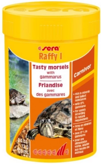 sera раффи I Nature – это лакомство без красителей и консервантов, состоящее из натурального, мягко высушенного гаммаруса (87%), мелкой рыбы и криля для водяных черепах и других (иногда) хищных мелких рептилий, а также земноводных.