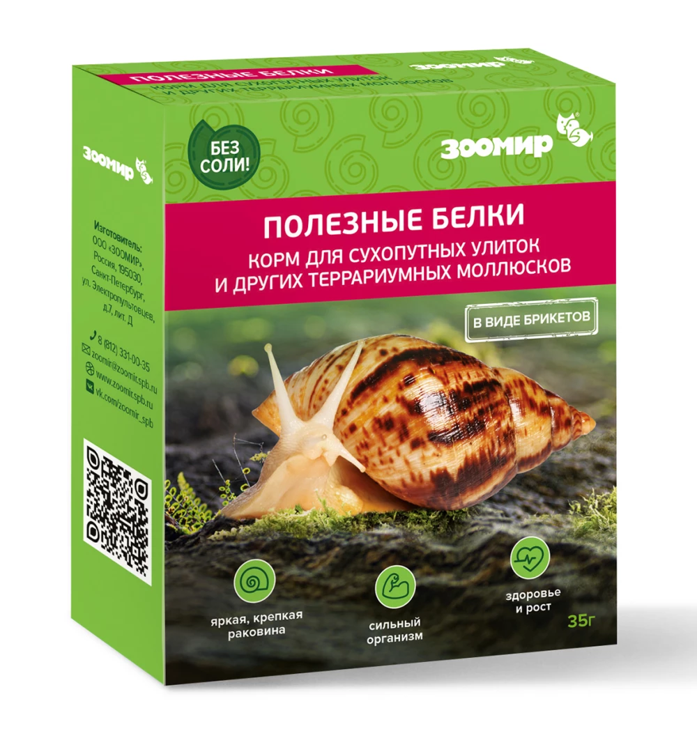 «ПОЛЕЗНЫЕ БЕЛКИ» – полноценный корм для регулярного кормления сухопутных улиток: ахатин, архахатин, лимиколярий, мегалобулимусов, виноградных и других улиток и моллюсков, а также мокриц, кивсяков и т.п. Ароматные брикетики, которыми удобно кормить моллюсков, содержат в сбалансированном виде все самое необходимое для здоровья ваших питомцев, особенно для молодых растущих и ослабленных: повышенное количество белков растительного и животного происхождения и биогенный кальций – для правильного развития и укрепления организма отборные травы, овощи и злаки – основные составляющие рациона спирулину – богатый источник аминокислот и витаминов