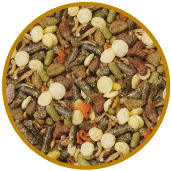 Гранулы, содержащие травяную муку, семена злаковых и бобовых растений, фрукты, ягоды, соевый белок, пивные дрожжи, витаминно-минеральный комплекс, сухие овощи, гаммарус.