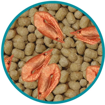 Мелкие ракообразные, креветки, рыбная мука, пшеничная мука, водоросли, соевый белок, раковины моллюсков, пивные дрожжи.