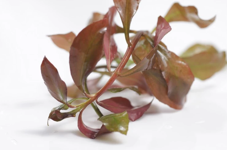 По форме листья у людвигии ползучей могут быть округлыми или яйцевидными. Длина их варьирует в пределах 2-3 см, ширина – 0,5-1,5 см. Окраска верхней части изменяется от темно-зеленой до оливковой, нижняя часть зеленая или красновато-лиловая. Стоить отметить, что чем ярче освещение в аквариуме, тем интенсивнее проявляется красный цвет. Одна из форм ползучей людвигии под названием «Рубин» имеет темно-красные листья и стебли.