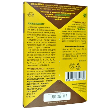 «УНИВЕРСАЛ-2» — универсальный ежедневный корм для большинства видов аквариумных рыб: живородящих, цихлид, харациновых, лабиринтовых, карповых, различных сомов и др. рыб длиной 6-12 см. Этот корм полезно 1-2 раза в неделю чередовать с кормом «Флора».