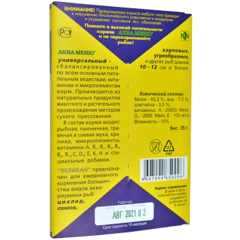 «ВЕЛИКАН» — универсальный ежедневный корм для большинства видов аквариумных рыб: цихлид, сомов, карповых, угреобразных и других рыб длиной 10-12 см и более.