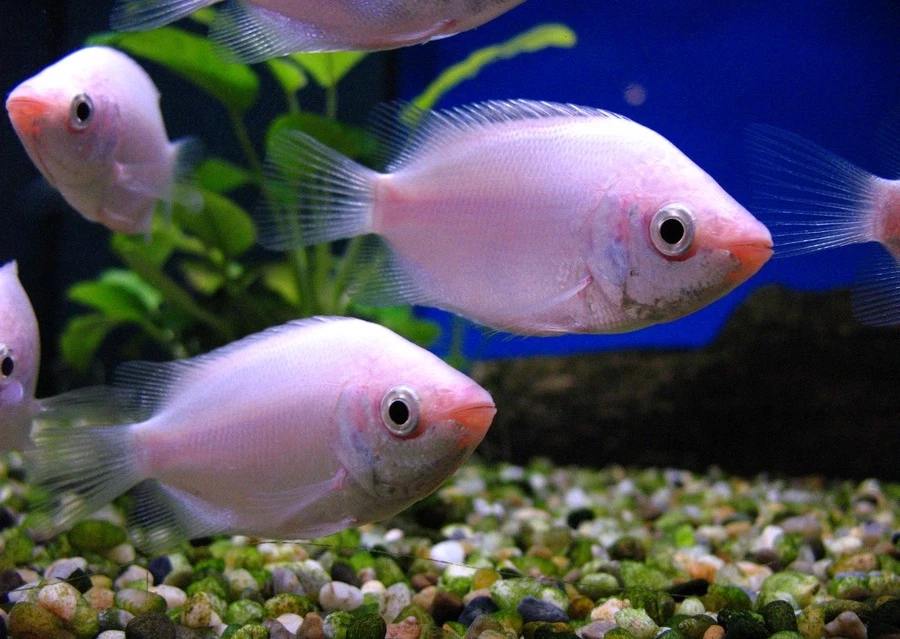 Гурами целующийся Синонимы: Хелостома Темминка Целующийся Гурами, научное наименование Helostoma temminkii, принадлежит семейству Helostomatidae. Впервые эта рыбка была описана в начале XIX века, но размножить ее в неволе удалось лишь только в 1950 году. Видовой эпитет «целующийся» был дан гурами за интересную форму поведения. Периодически две особи (как самцы, так и самки) становятся друг напротив друга, некоторое время плавают, а потом в один момент на короткое мгновение сцепляются губами. Со стороны это очень напоминает поцелуй. Но как показали более детальные исследования – это не «любовь» и не форма полового поведения, а попытка установить свой социальный статус в стае. Место обитания В природе гурами целующийся чаще всего встречаются в Таиланде и Индонезии. В природе существует две цветовые разновидности — серовато-зелёная и розовая. Серовато-зелёная форма происходит из водоёмов Таиланда, её тело окрашено в серые тона, у некоторых особей оно приобретает зеленоваты оттенок. Имеются отчётливые тёмно-коричневые полосы, тянущиеся от хвоста до головы и продолжающиеся на плавниках. Розовая форма наиболее популярна среди аквариумистов. Окраска тела оранжево-розовая с прозрачными или полупрозрачными розовыми плавниками. На её основе искусственно выведен вид Розовый целующийся Гурами, который несколько меньше и своего предшественника. Размеры: средний размер рыбки в аквариуме 12-15 см, хотя в природе они нередко вырастают до 30 см и являются объектом рыболовного промысла для местного населения. Оптимальные параметры воды для содержания рыбок Температура 22 - 28°C Кислотность 6.0 - 8.8 pH Жесткость 5-35 GH Содержание Содержать гурами целующихся лучше всего группами, где на одного самца приходится 2-3 самки. Минимальный объем аквариума для такого набора рыбок должен быть не менее 100 литров. Как и при содержании других лабиринтовых, аквариуму необходима крышка или покровное стекло, которое не позволит, во-первых, сильно охлаждаться воздуху над поверхностью воды (что может повредить лабиринтовый орган), и во-вторых, будет препятствовать выпрыгиванию из аквариума особо активных гурами. Грунт лучше выбирать темный, рыбки с неяркой окраской будет смотреться с ним контрастнее, наличие разнообразных укрытий в виде коряг и камней. Можно посадить аквариумные растения, лучше жестколистные и несъедобные формы — эхинодорусы, криптокорины, анубиасы, яванский мох, таиландский папоротник, включая и плавающие виды. Их рассаживают вдоль стенок и группами около коряг. Фильтрация желательна, но не стоит создавать в аквариуме сильное течение. Регулярные подмены воды (30% в неделю) не позволят накапливаться в аквариуме азотистым соединениям и благоприятно скажутся на самочувствии рыбок. Совместимость гурами целующихся напрямую зависит от возраста и индивидуальных особенностей конкретных рыбок. Приобретать лучше всего молодых гурами, еще не достигших половой зрелости. В этом возрасте они наиболее миролюбивы и подходят для содержания в общих аквариумах с неагрессивными соразмерными рыбками. По мере взросления характер у гурами ухудшается, они начинаются нападать на мелких (а зачастую и на крупных) соседей по аквариуму. При недостаточном объеме аквариума, малом количестве растений и укрытий агрессивность проявляется чаще. Можно содержать их с себе подобными, но не с